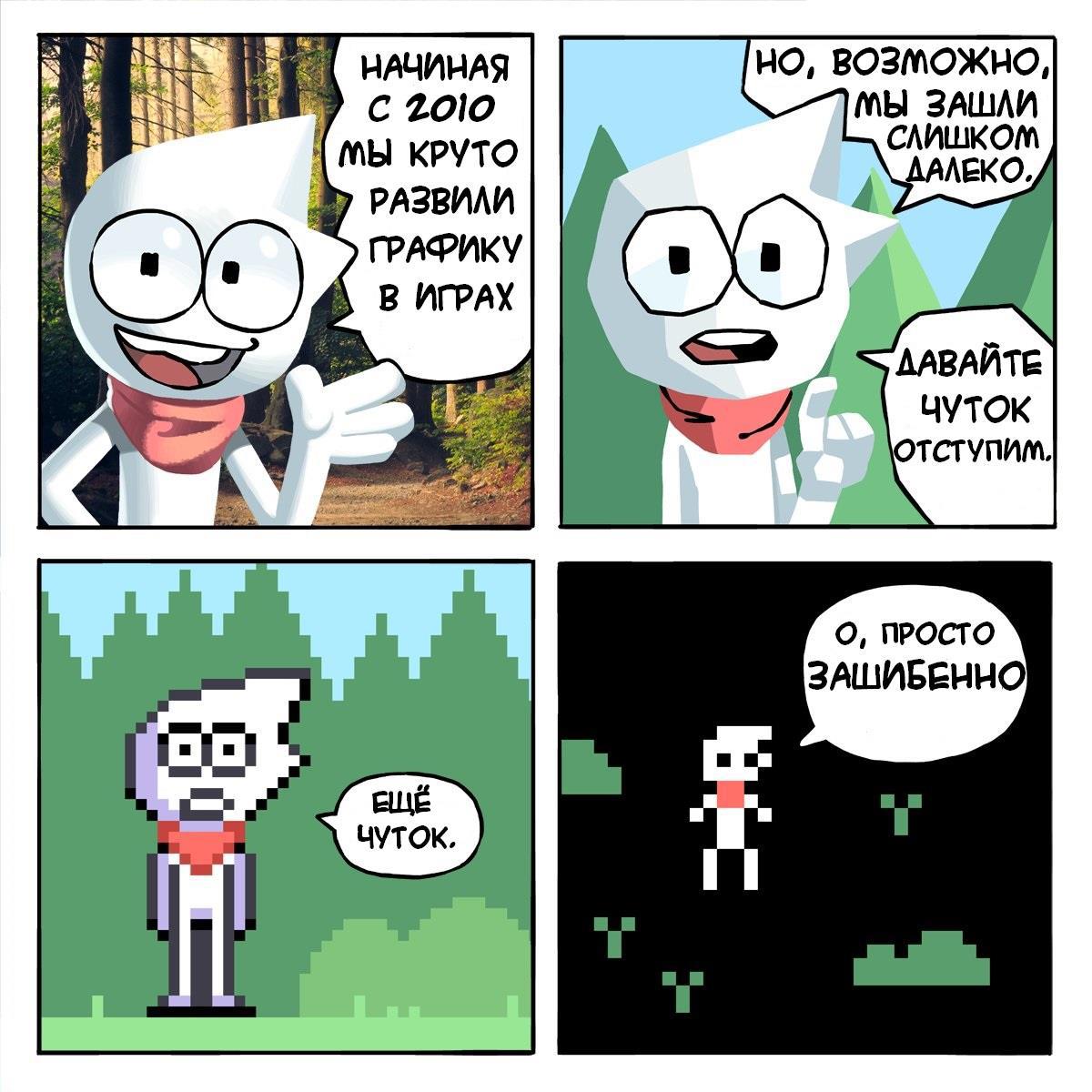 Я вырос примерно на графике, где "ещё чуток", хотя в детстве у меня был пиратский клон приставки Atari со встроенными играми. Это прямо самые пиксели из всех возможных пикселей. Помню, как офигевал, когда в пять лет пытался разобраться в игре Superman - кто хочет, гляньте геймплей на ютубе, там без контекста чёрте что творится!