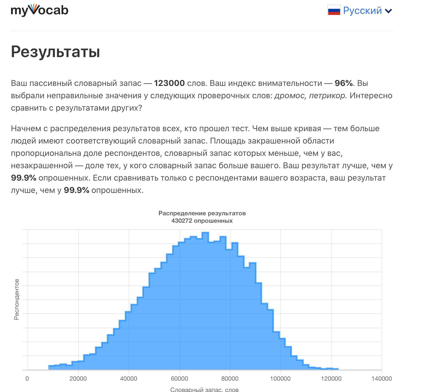Автор: pascendiСвой словарный запас легко проверить вот здесь: https://www.myvocab.info