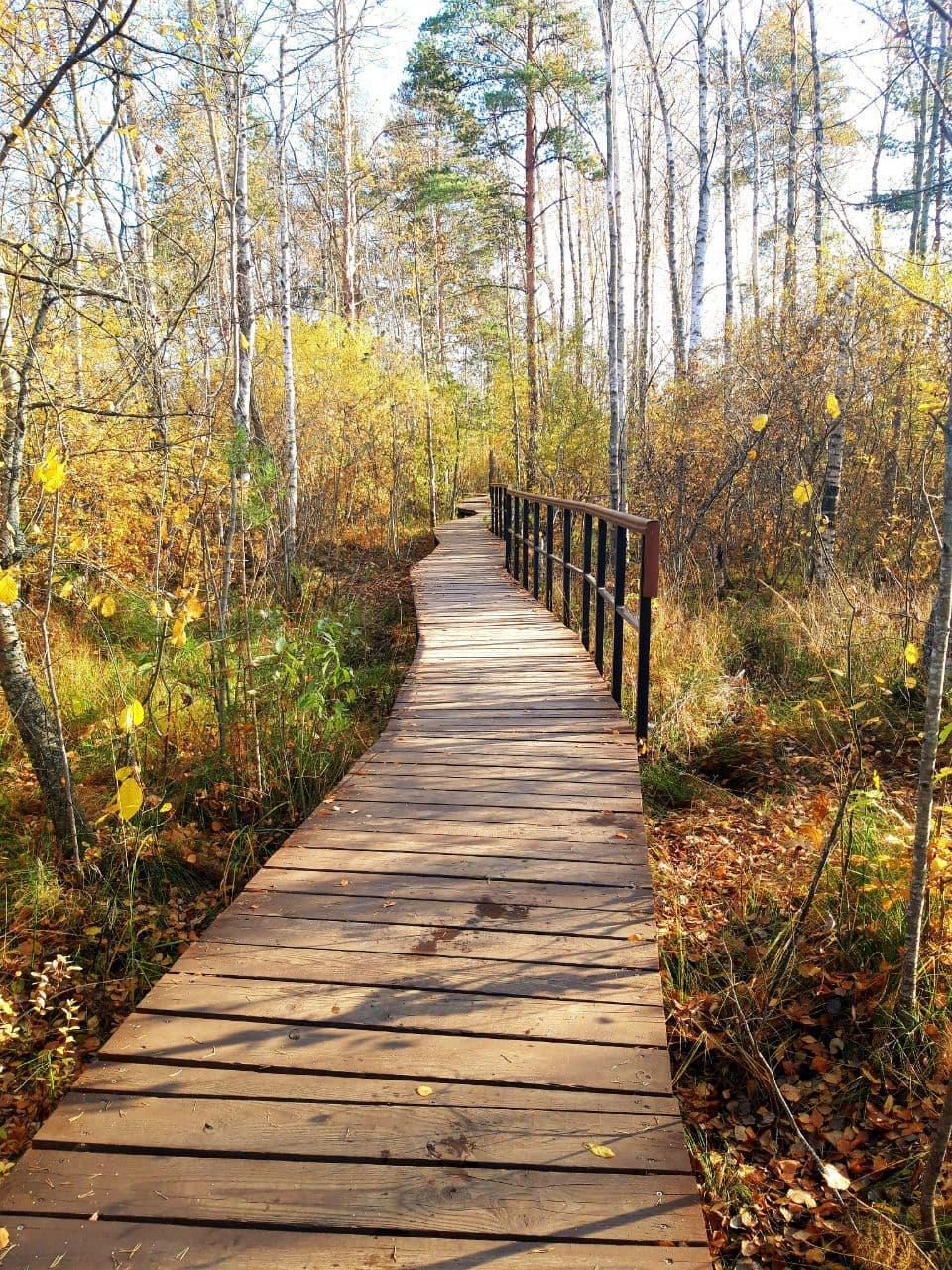 Экотропа — это не только деревянный настил, но и участки с естественной тропой, устланной мягким хвойным ковром. В отличие от настила, здесь намного больше пространства для прогулки.