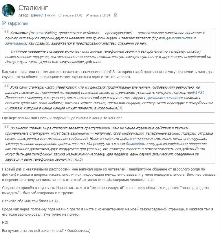 Тем же днём он публикует пост обо мне. Пост ОБО МНЕ!! Я в восторге. Мой любимый автор в своём собственном блоге пишет ОБО МНЕ...