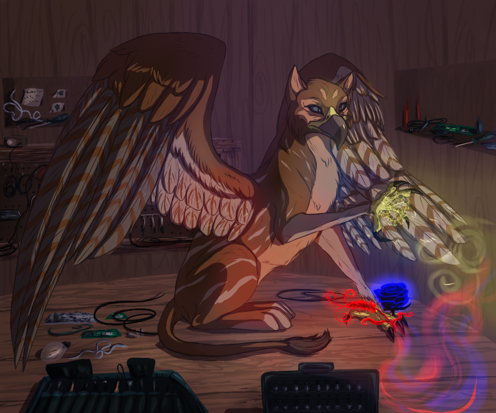 Ну и грифоны - потому что это моя любовь. Грифоны у Дианы Уинн Джонс ну очень симпатичны, и хотя они скорее люди по психологии (это объяснено), но и звериные-птичьи черты в их характерах есть, и это клево сочетается. Их фразы из серии "клюну", всякие нахохливания-поворот головы набок (обожаю, использовала у себя в текстах, взяла эту черту от овчарок и было круто видеть, что любимый автор видит грифонов так же). Здесь - Калетта, моя любимица при каждом прочтении (на сдвоенные согласные в именах у моих грифонов вдохновилась именно у Дианы Уинн Джонс). Одна из самых интересных грифонов там. Изобретательница, создавшая для каждой компании "попаданцев" Штуковины - магические артефакты для победы над Темным Властелином (на самом деле это электроника). У нее замечательный внутренний конфликт, сразу несколько внешних конфликтов, крутое сочетание вдумчивости, скромности и ярости, человеческой пытливости и грифоньей неуемности, а еще она настоящая творческая личность, и ее подход к работе мне нравится. Хотелось изобразить Калетту именно такой, как она описана в книге, и в читалке старалась не пропустить ни одного упоминания об ее внешности, в спойлере - побольше про работу над рисунком. Все надеялась, что в тексте не сказано, какие именно лапы у тех грифонов, но нет - передние птичьи) Ну и ладно - хотя я не поклонница такого грифоньего облика, но рисовать интересно.