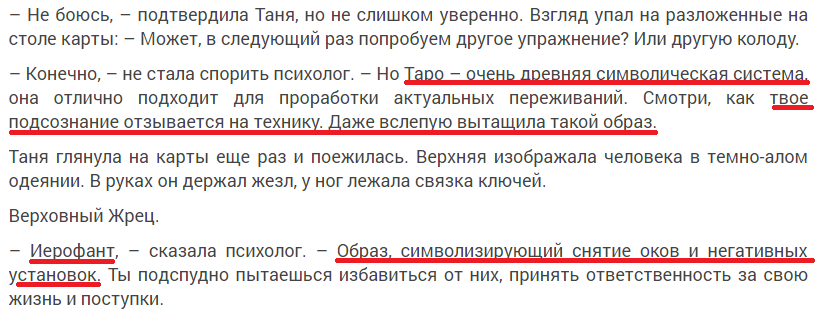 И ради чего так много слов - я вообще не люблю пояснять очевидное. Но когда попытался обойтись парой предложений, автор кажется меня не понял. Я утверждаю, что психолог вкладывает в действия девушки мистический смысл. Не потому что Таро, а потому что выбор вслепую. Мистификация действия. Автор говорит, что я не прав. Что это не мистификация, а обычная психологическая практика.