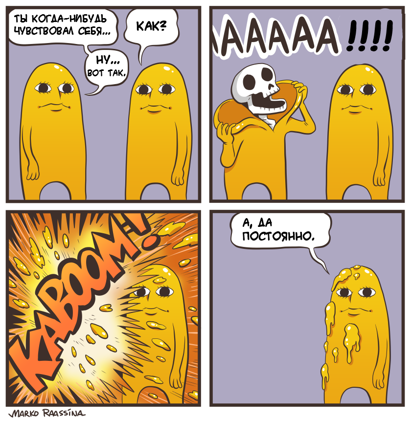Конкретно к этому комиксу - на нём не самые любимые персонажи художника, два жёлтых чувака, которые общаются на абстрактно-депрессивные темы, снабжённые годным визуальным юмором. Выраженное состояние "ААААА+взрыв", пожалуй, реально знакомо каждому.