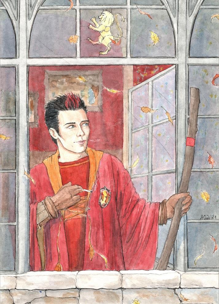 Окошко осеннее, гриффиндорское (и не совсем приятное по цветам моему сканеру — в реале колор лучше, ярче и ровней). И тут у нас самый лучший загонщик в факультетской команде по квиддичу и вообще огонь-парень