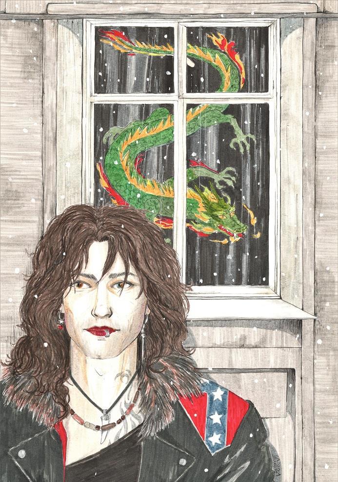 Ну а чувак у окна – единственный дракон, о котором я когда-либо писала. Живущий бесконечно долгую жизнь, нестареющий, обреченный терять смертных друзей и возлюбленных – все как полагается. Ну и да, бунтарь из восьмидесятых.