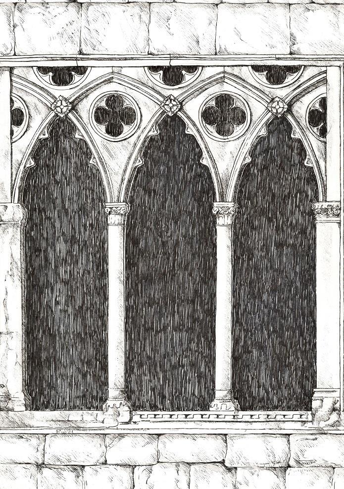 Сначала я хотела нарисовать просто архитектуру. Потом к архитектуре прибавилась мысль о каких-нибудь людях в костюмах эпохи Возрождения. Потом я услышала песню и уже целенаправленно стала думать про Р. и Д., и долго не могла решить, что же именно изобразить – миг свидания? Получение любовного письма? Что-то более символичное, вроде позабытых перчаток?..