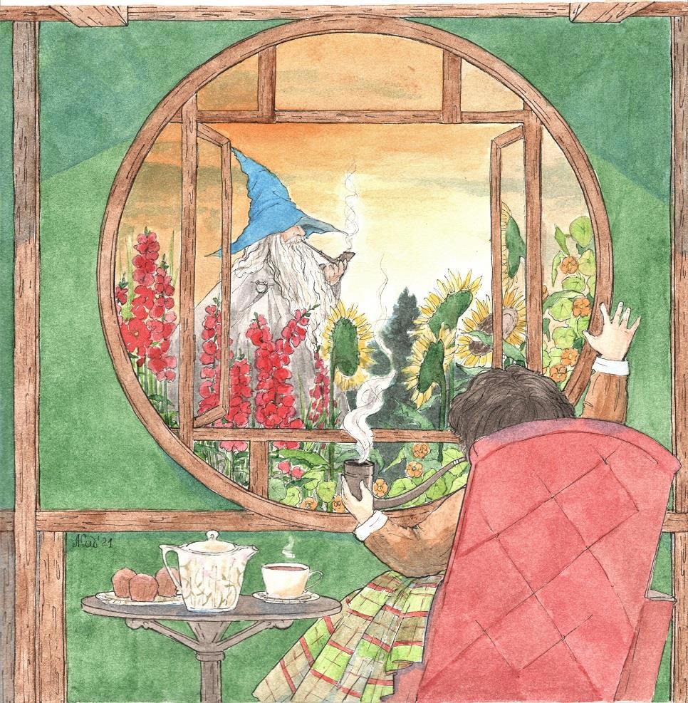 А Гэндальф и Бильбо сидели у открытого окна, глядя на запад, на цветущий сад. День клонился к вечеру, свет был чистый и яркий. Темно-алые львиные зевы, золотистые подсолнухи и огненные настурции подступали к круглым окошкам.