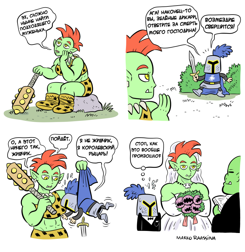 Первый комикс из немаленькой уже серии художника Марко Раасина "My Girlfriend Is an Orc Warlord!", т.е. "Моя девушка - вождь орков!". Повествует о нелёгкой судьбе королевского рыцаря, которого могучая орочья дева избрала себе в суженные. Комикс забавный и немного хулиганский, обыгрывает фэнтезийные тропы разной степени избитости и шутит на тему половой жизни парочки.