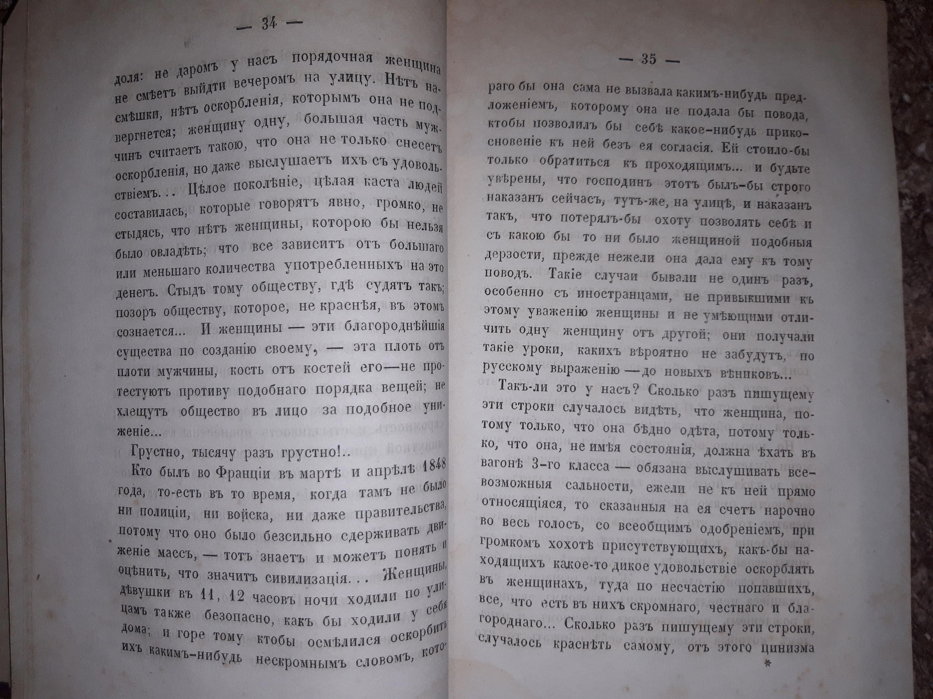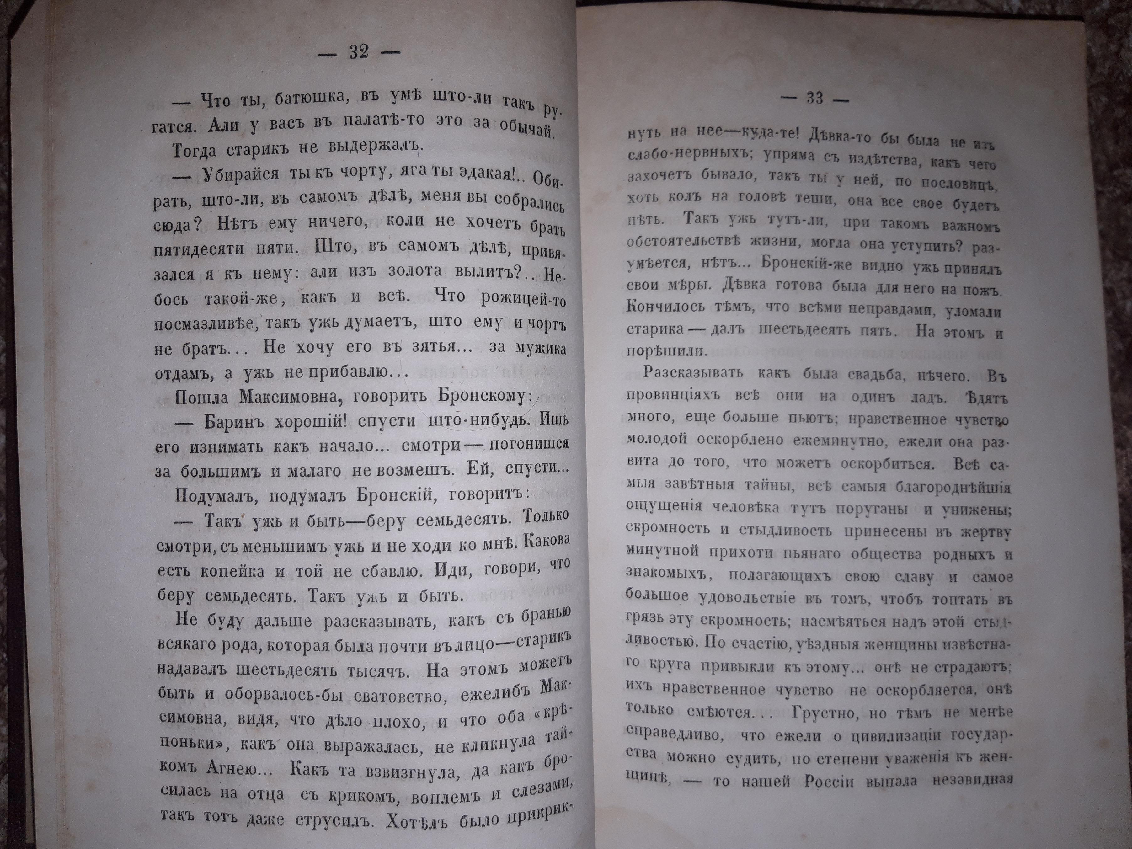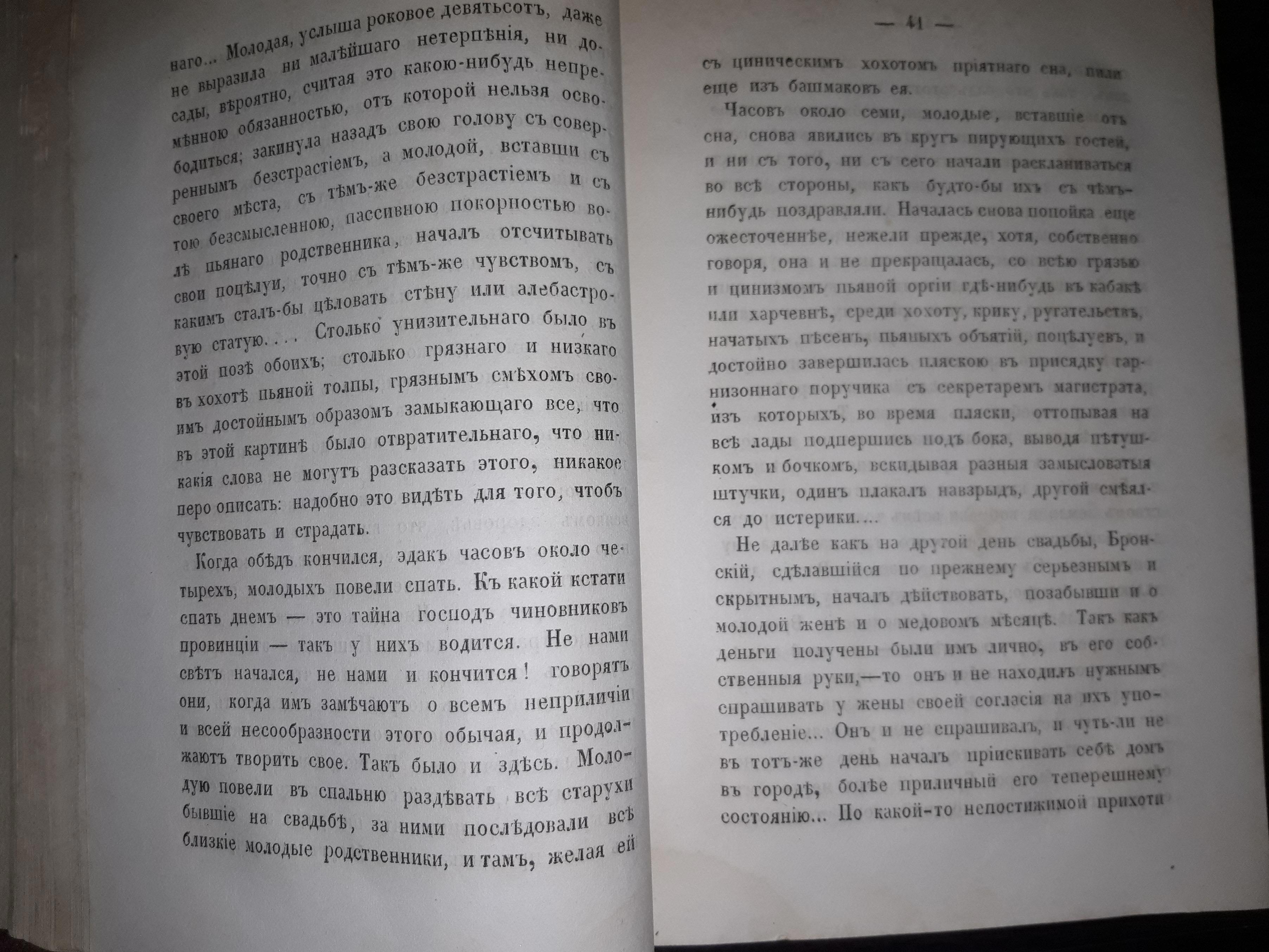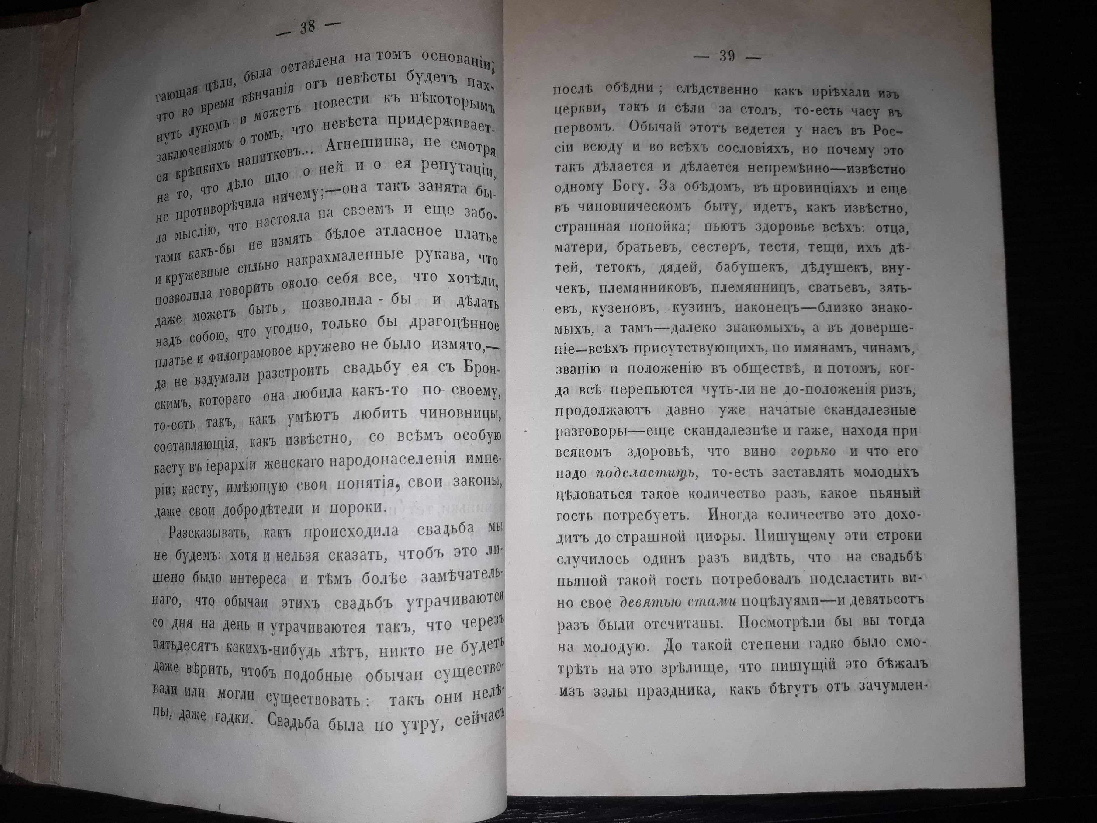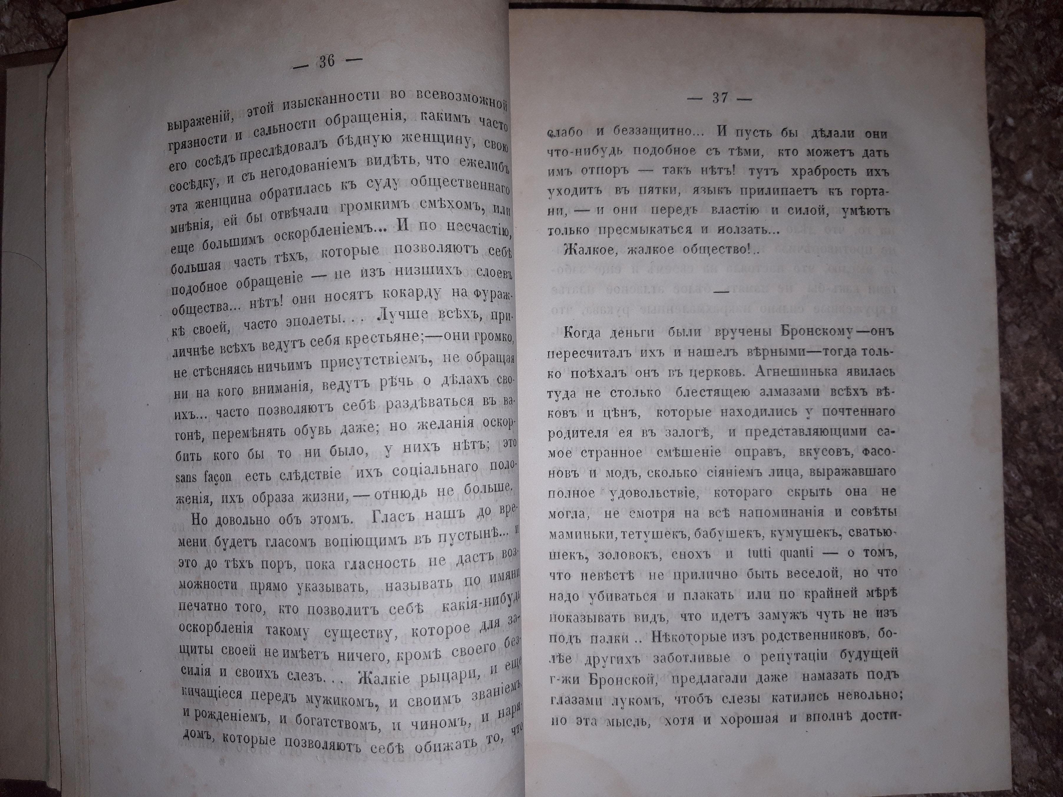 Здесь, помимо описания, собственно свадьбы, автор ещё пускается в рассуждения по поводу положения русской женщины в обществе, сравнивает его с положением женщин во Франции во времена Парижской коммуны. Общий настрой автора пессимистичен, чувствуется его скепсис и недовольство. Надо полагать, интеллигенция того времени была недовольна не только правительством либо царём, а в целом страной. Их можно понять - если не говорить о недостатках, власть имущие не будут ни на что обращать внимания. Только вот - где она, та грань, отделяющая здравомыслящую критику от деструктивного охаивания всего и вся? Вопрос, актуальный и по сию пору.