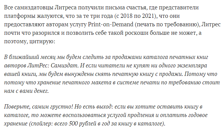 Еще раз (да, это сложно) - за хранение 1 печатного макета (то есть электронных данных) в системе автор, который хотел продавать через Литрес свою книгу в режиме "Печать по требованию", теперь будет платить самому сайту "всего" 500 руб в год. Уточним: если его книгу и так не покупают, то автор еще и будет платить Литресу! И чтобы совсем уж быть занудным заклепочником - вроде бы на Литрес продавать в режиме "Печать по требованию" можно только эксклюзивные книги (это могут быть устаревшие данные, интересовалась N время назад).