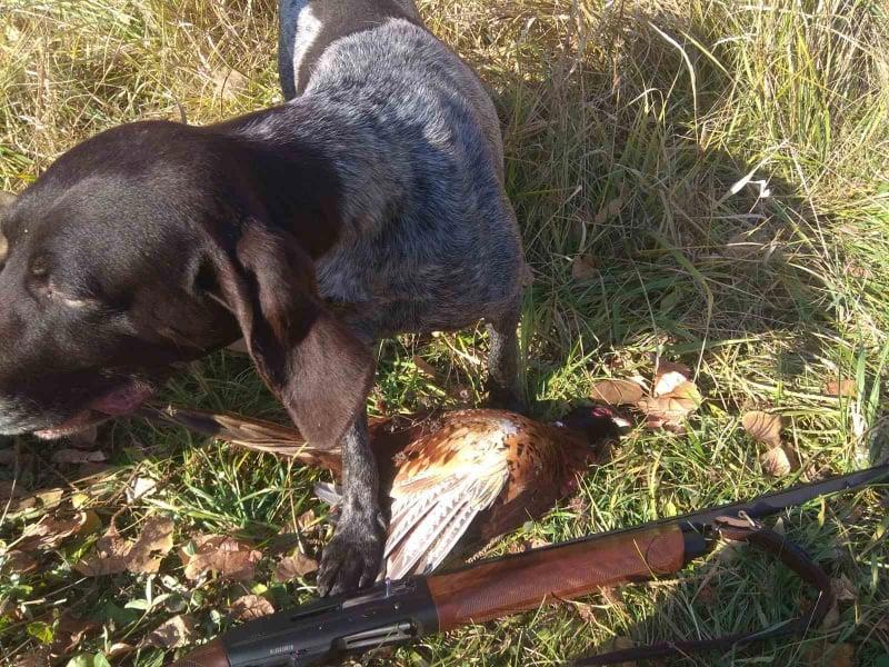 В роли собаки - курцхаар Боня, в роли петуха - петух подсемейства Phasianinae семейства Phasianidae, в роли ружья - Franchi Inertia Affinity.