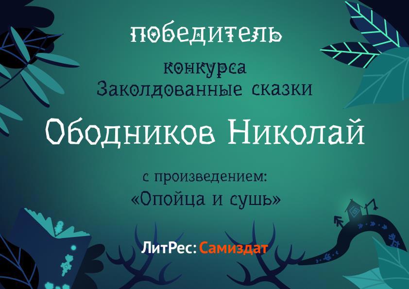 Автор: Николай ОбодниковПрошло каких-то три часа (в ретроспективе), как объявили победителей конкурса «Заколдованные сказки», а я до сих пор чувствую вокруг себя тепло, словно от приема горячей ванны. Да, рассказ «Опойца и сушь» вошел в десятку победителей. Честно говоря, я сомневался в победе. Хотя бы потому, что рассказ представляет собой больше мистический реализм, нежели сказку. Тем не менее вот мы — жмем руки остальным победителям.