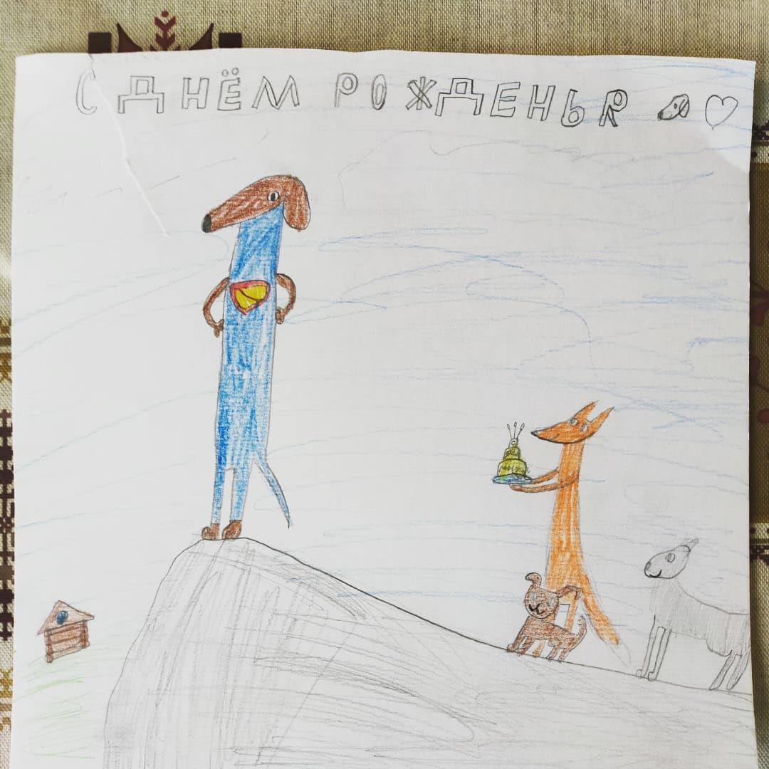 Пока Василиса вручала свой рисунок и подарок, такс Рыжий забрался на стол и сожрал все приготовленные для меня оладьи. Теперь ходит толстый и красивый. Словно это ему 45, а не мне (такса ягодка опять). Кофе вылакать не успел (в этот раз). Раскаяния он не чувствует. Жизнь прожита не зря, словно написано на наглой рыжей заднице.