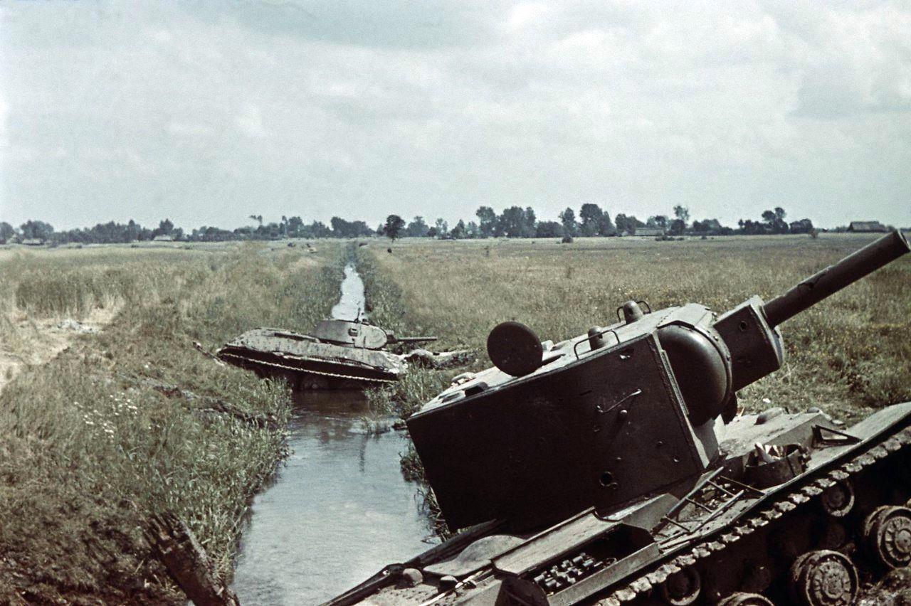 Т-34 и БТ-7, застрявшие при форсировании реки Черногостица. Лето 1941 года