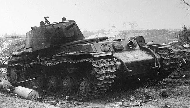 Для выведения из строя этого КВ-1 потребовалось пять попаданий в башню из 88-мм зенитки. Июнь 1941 года