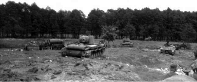 КВ-2 и Т-34 8-й танковой дивизии 4-го механизированного корпуса, застрявшие, а затем подбитые 23 июня 1941 года в районе села Старый Майдан Радеховского района Львовской области
