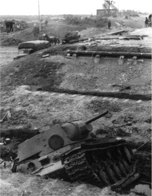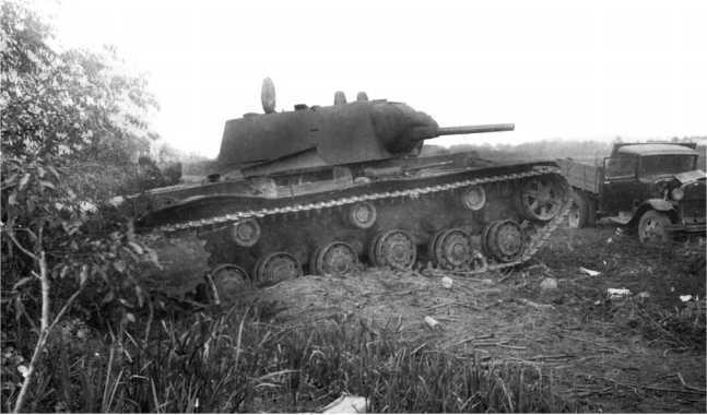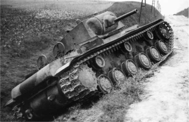 КВ-1 14-й танковой дивизии, застрявший и оставленный экипажем. Июль 1941 года