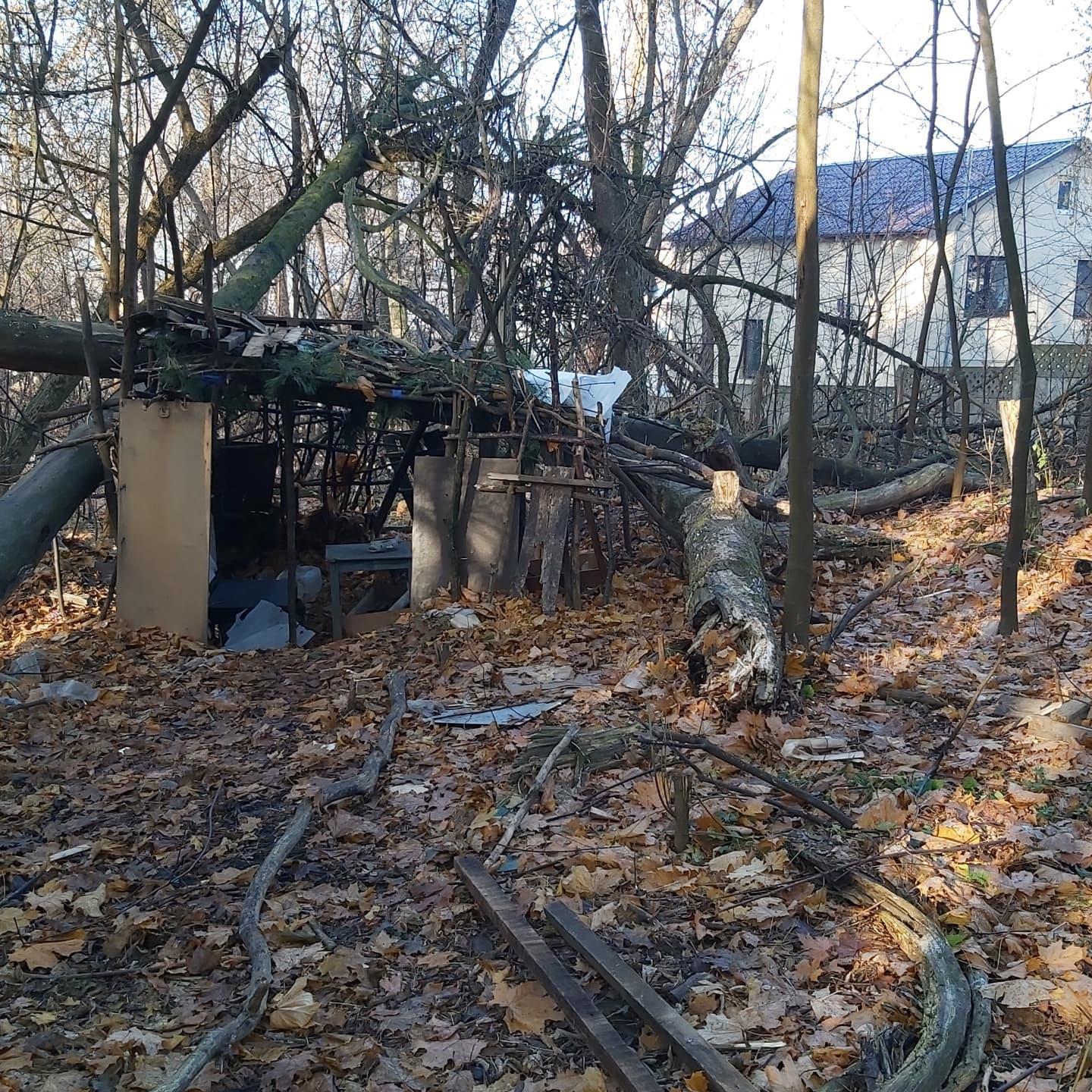 Автор: Эдуард СеменовИду, значит, я вчера по парку и вижу это чудо. Сразу вспомнил свое детство. Сколько я таких шалашей, землянок настроил. Не счесть. А потом подумал. Ведь диверсантов, которых в парке готовили, тоже учили делать временные укрытия. Может это заразно? Или передается по наследству на генном уровне?