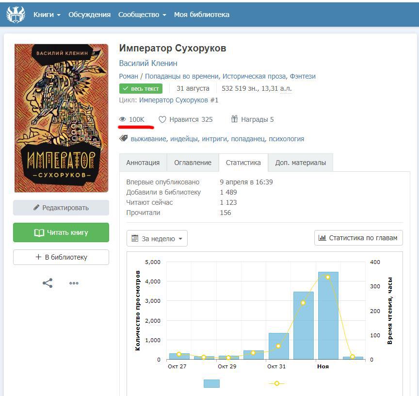 Автор: Василий КленинА минувшей ночью мой роман «Император Сухоруков» собрал сто тысяч просмотров.