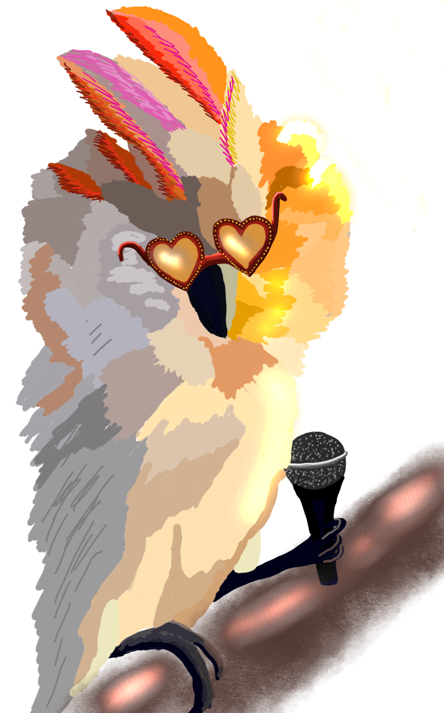 После на сцену выходит, а точнее даже вылетает страстный попугай: