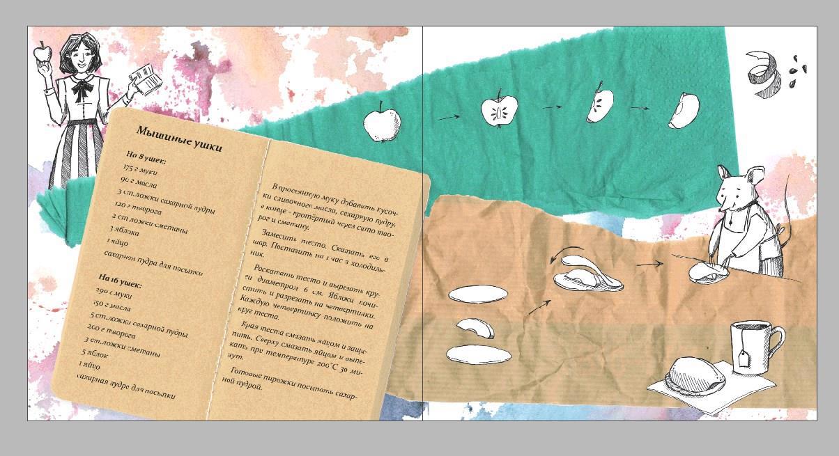 Плюс доделала дизайн последней страницы - там рецепт "Мышиных ушек" с яблоками, всё по тексту)))