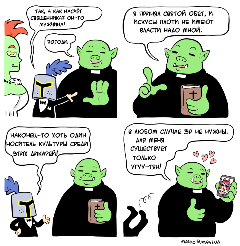 Орк-католик с виртуальной вайфу в смартфоне - это сильно %) Автор отвечает на некоторые вопросы, зато сколько рождает новых! В целом, конечно, искать связный лор в стёбных комиксах - занятие неблагодарное.