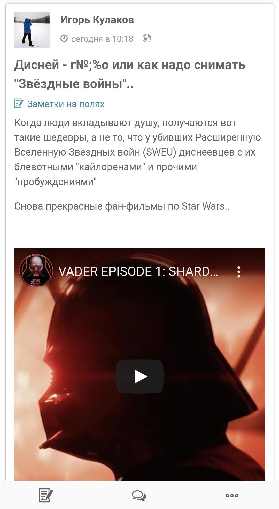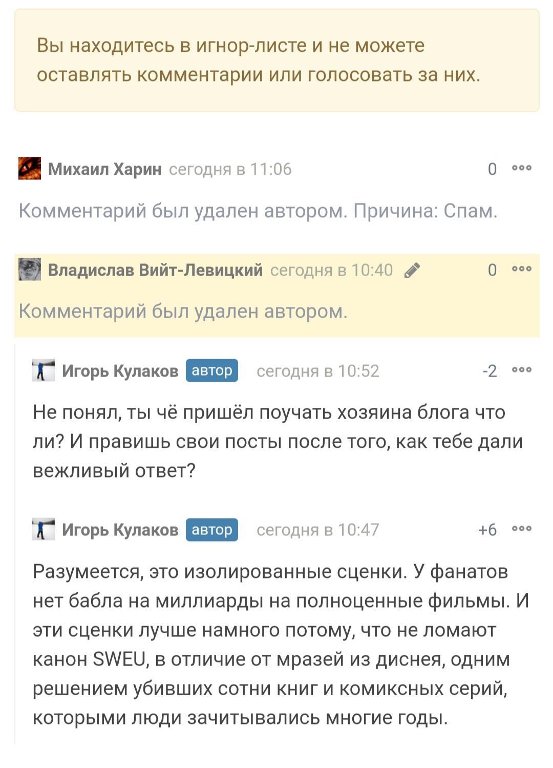 Я закономерно возмутился и спросил о том, как так вышло, что у авторов, пишущих прямое продолжение оригинальной серии, что-то может быть неканоничным, если только они сами и являются источником инфы о том, что канон, а что не канон. Последние фильмы по ЗВ - вполне обычное кинцо, нет там ничего плохого и уж точно они не хуже чем быссмысленные фанатские сценки. Человек явно страдает от синдрома утенка и считает, что если ему нравится оригинальная трилогия, то он имеет право голоса в вопросах развития франшизы и лучше авторов знает, что хорошо и что плохо в решениях, которые его не касаются и в которых он ничего не смыслит.