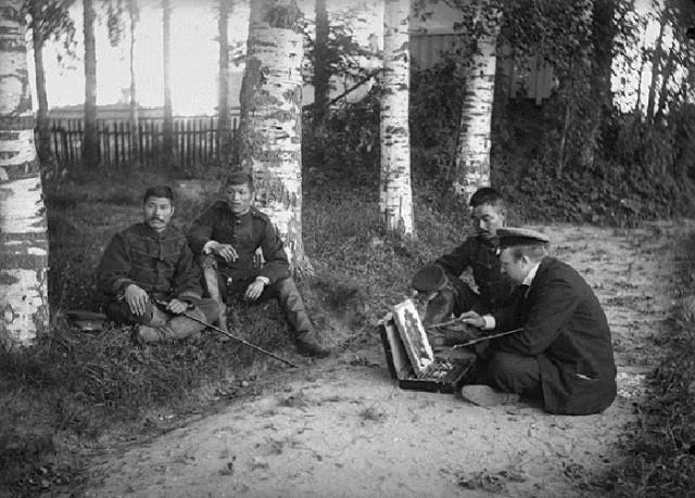 На фото автор картин Иван Владимиров (справа) делает зарисовки с группы пленных японских офицеров. 1900-е