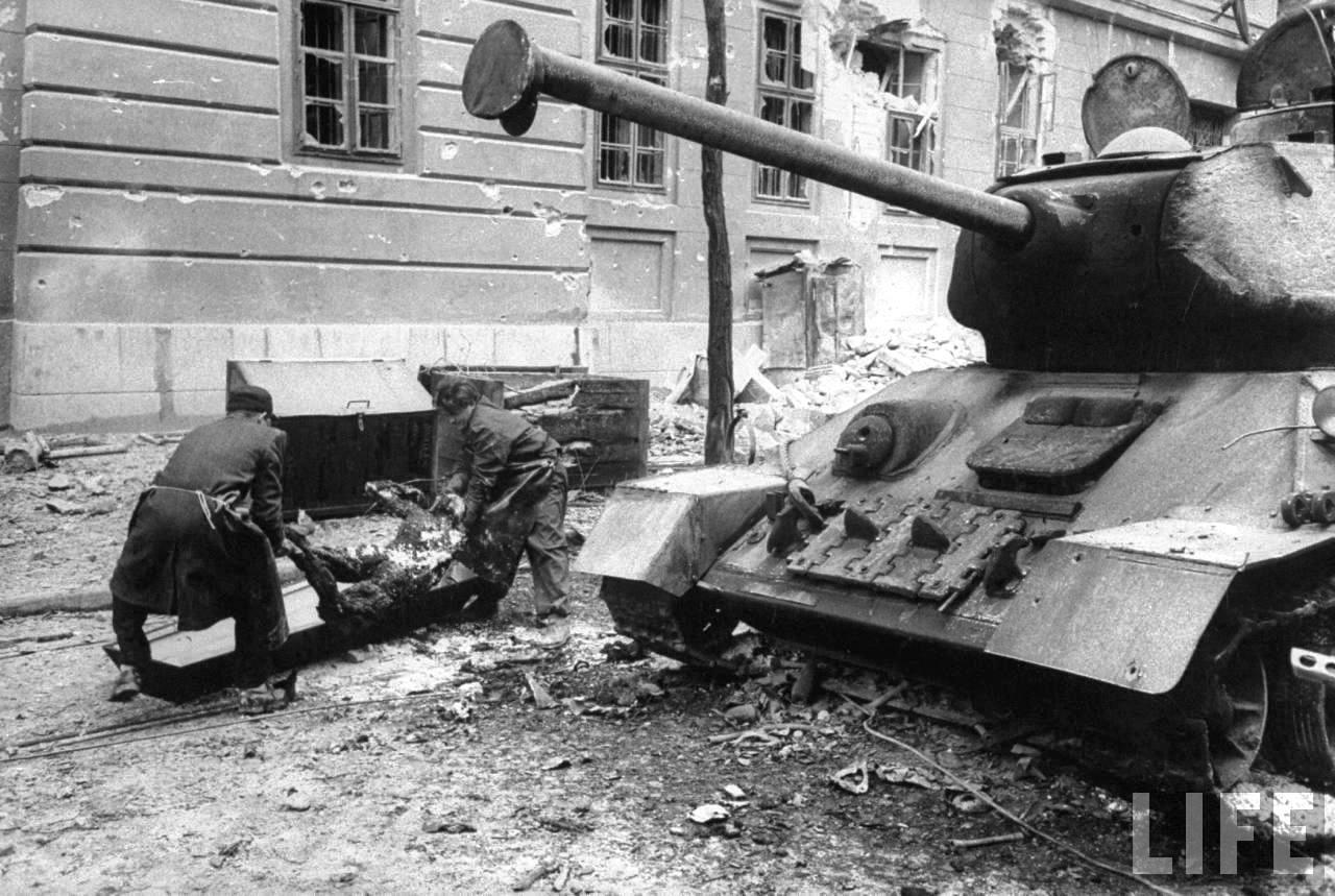 Мирные демократические студенты. Помните того - с первой фотографии? Который с Молотовым? Пользуясь тем, что бесчеловечным слугам тоталитаризма было запрещено руководством КПСС и лично Хрушевым открывать огонь - мирные демократические студенты жгли технику практически безнаказанно. На фото подбитый тяжелый танк ИС и его экипаж. Эти традиции ужасного тоталитаризма проявлялись и позже - когда к примеру при входе в г. Грозный в 1994 под Новый год наши войска получили именно тот же приказ - огня не открывать. С тем же результатом. Никак не могу понять - зачем так делать - вводить войска на избиение, запрещая отвечать...