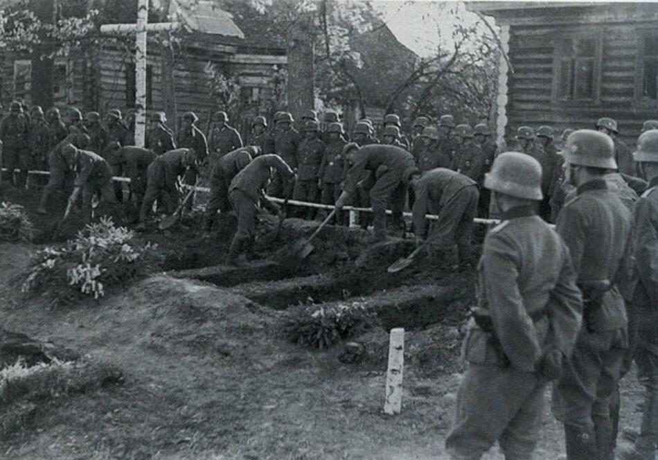Пленные копают могилы, себе или кому другому, непонятно. Но вряд ли себе, если себе, копали бы общую.