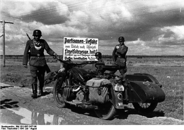 Табличка прямо из текста: примерный перевод: "одиночным машинам проезд запрещен, оружие держать наготове, партизаны..."