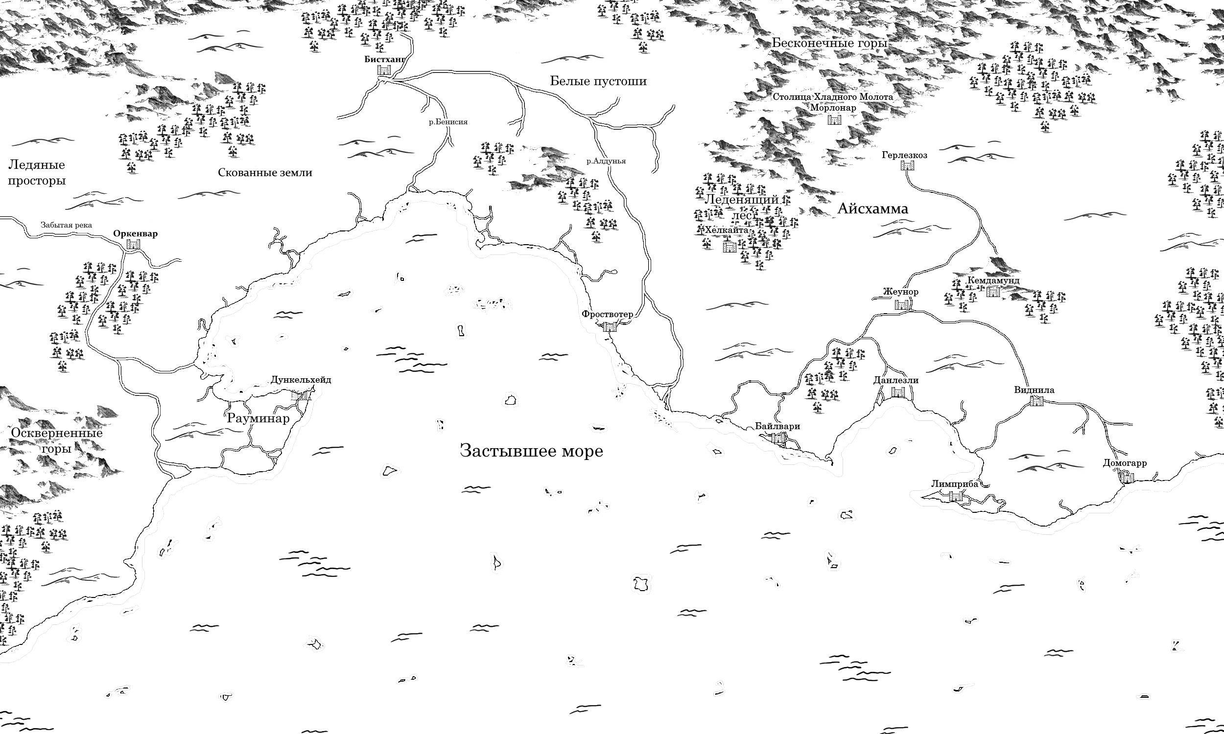 А это Застывшее море на берегу которого находится город. Тут же и территория северных дварфов недалеко. Северные орки живут в Скованных землях, терийцы восточнее обитают и часто воюют с орками. В саму столицу авантюристы в основной своей массе попадают через город людей Фроствотер, и переплывают Застывшее море. Само море очень опасно и крупный флот его преодолеть без знающих местные воды не сможет. То есть маленькое судно еще можно лавировать и проскочить, а крупный фрегат, увы, не осилит. Нежить-пираты хорошо обосновались тут и знают какие места безопасны, а какие имеют подводные айсберги. Торговцы попадают туда также благодаря пиратам, а некоторых доставляют орки, без них найти путь в снегах очень сложно.