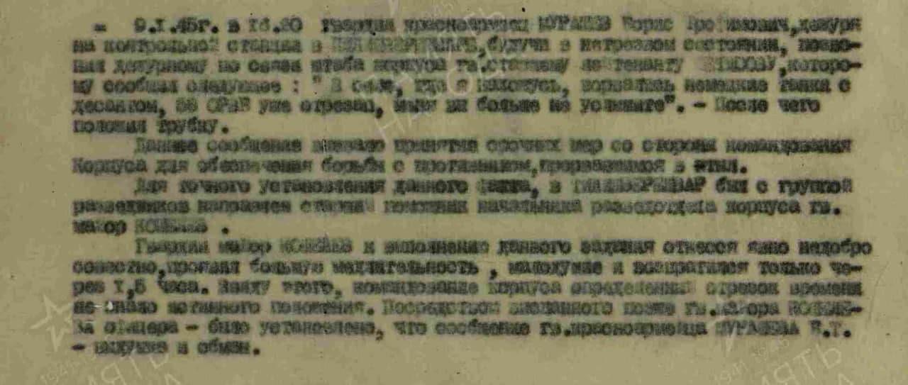 "Качество документа отвратное, но содержание приказа ярчайшее. Кратко так. В один из январских дней 1945-го в штабе 2 гв. мехкорпуса зазвонил телефон. Дежурный снял трубку и услышал там "где я нахожусь прорвались немецкие танки с десантом, батальон отрезан, меня вы больше не услышите". После чего трубку положили. Звонили с тыловой станции. Дежурный тут же доложил, что в тыл корпуса прорвались немецкие танки. Так как в тот момент наши войска рубились в Будапеште, давя окруженных немцев, командование корпуса сильно напряглось от такой новости. Немцы прорвались и уже в тылу! На станцию тут же был послан майор с проверкой новости. Но он вернулся лишь спустя полтора часа, а за это время начальство откладывало "кирпичи", не ведая обстановки. Выяснилось: звонивший в штаб дежурный красноармеец был в дупель пьяный и его посетила "белочка" с "танками". Так что новость оказалась ложью. Дурака тут же отдали под трибунал. Его непосредственный командир и замкомандира были отправлены под арест за пьянство и распущенность подчиненных. Майор, заставивший начальство ждать, получил выговор."(с)коллега Нагирняк.