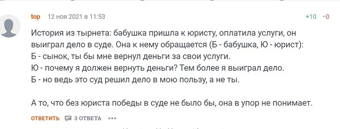 Вижу в комментариях историю, которую я рассказывал около 3х лет назад! В сильно сокращенном виде... но я рассказывал эту историю 3 года назад еще в первом сборнике "Юридические истории", а человек до сих пор помнит!