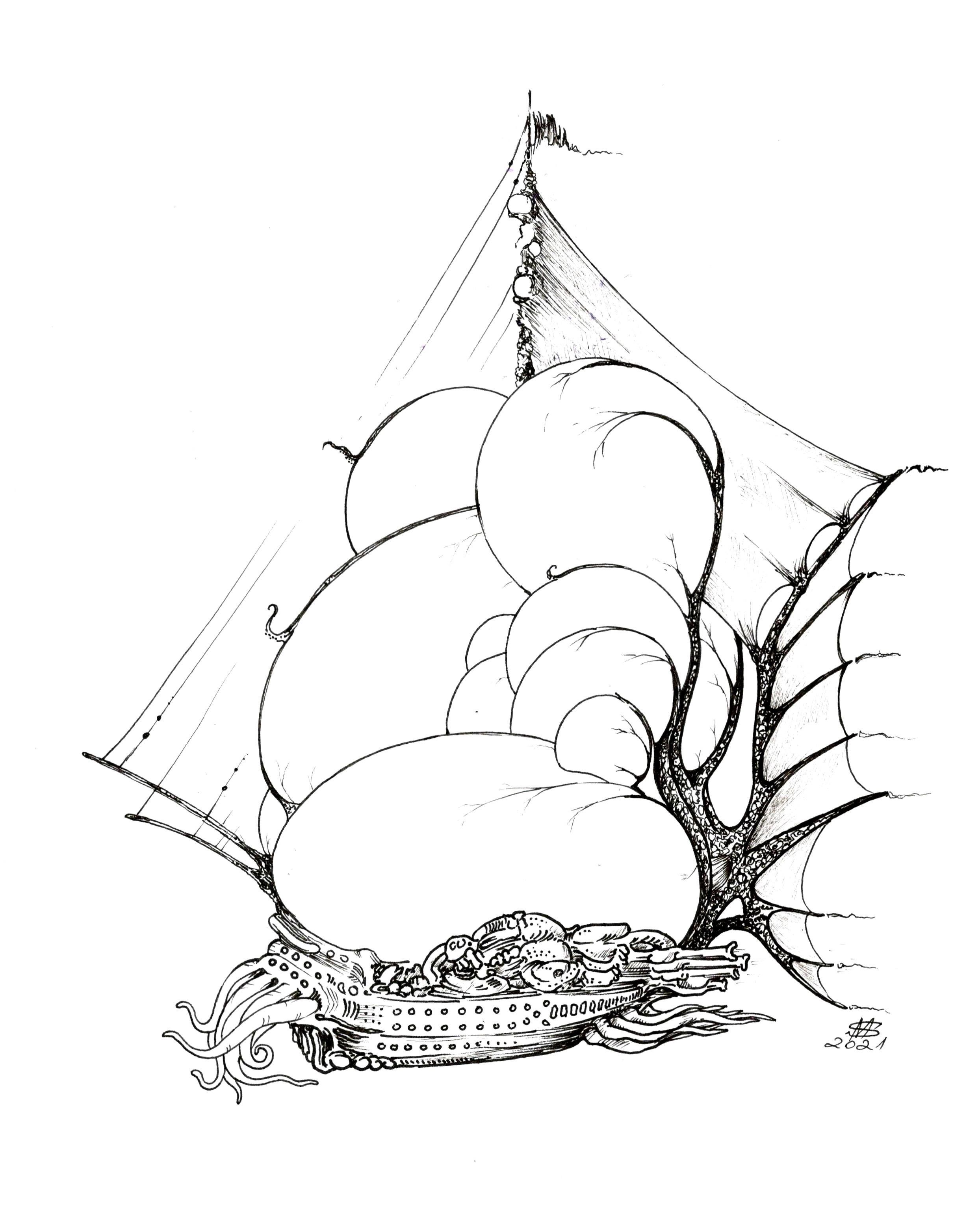А тут ещё у Марики дошла очередь и до меня. Как-то я умудрилась напроситься на рисунок по "Демиургам и химерам". Я их не бросила, если что. Просто у меня с ними сложные отношения. Так вот, я просила Марику нарисовать мне живой дирижабль. Пани кокетничала и сетовала на то, что, мол, не умеет технику. Но теперь-то я ей не верю: посмотрите, какой крутотеньский кораблик она мне нарисовала! С хвостом, щупальцами и воздушным пузырём. Вот!