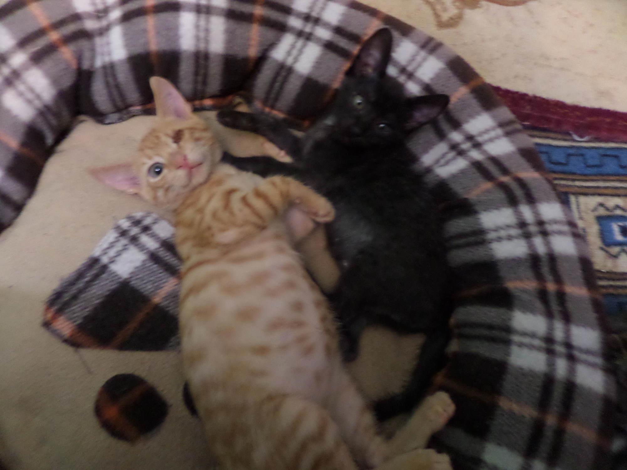 А Пончик вылизался, подтянул лапами к себе Кузю и давай ее причесывать. Все ей почистил, ушки, лапки, животик, мордочку своим наждаком вылизал. Ой, умора. Кузя ерепенилась, пыталась вырваться. Не тут -то было. Папка бантики вплетал в косы. Потом так и уснули. Вповалку. И тишина.
