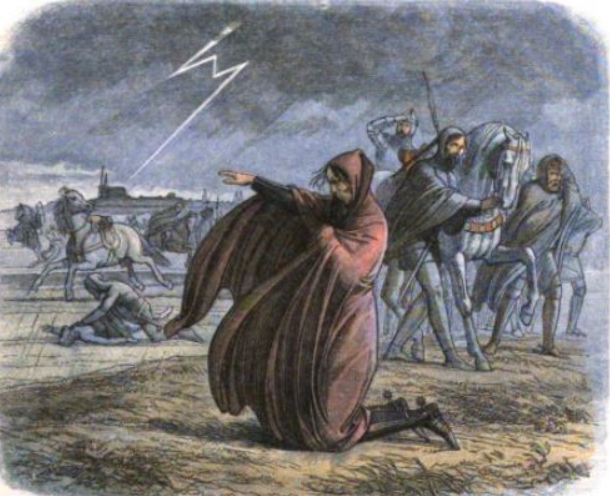 Эдуард III. Рисунок из книги "The History of that Most Victorious Monarch Edward III" (1688) Джошуа Барнса. За спиной английского короля видна его армия, взбесившиеся лошади, молнии и чёрные грозовые тучи, а также стены Шартра и шпиль Шартрского собора.