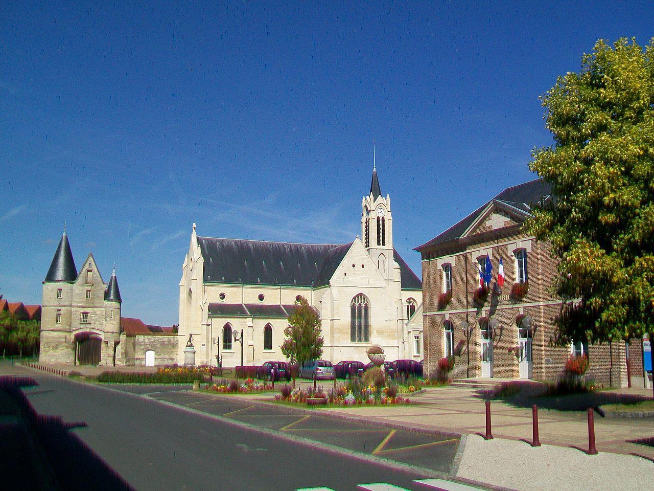 Ратуша, церковь и крепостные ворота XVI века в Longueil-Sainte-Marie.