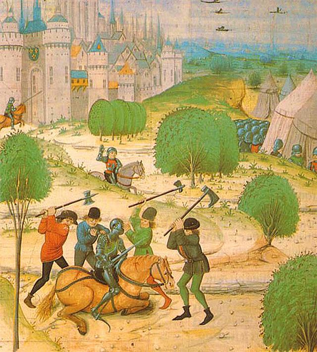 Крестьяне напали на рыцаря. Миниатюра из "Хроник" Жана Фруассара. XIV век.