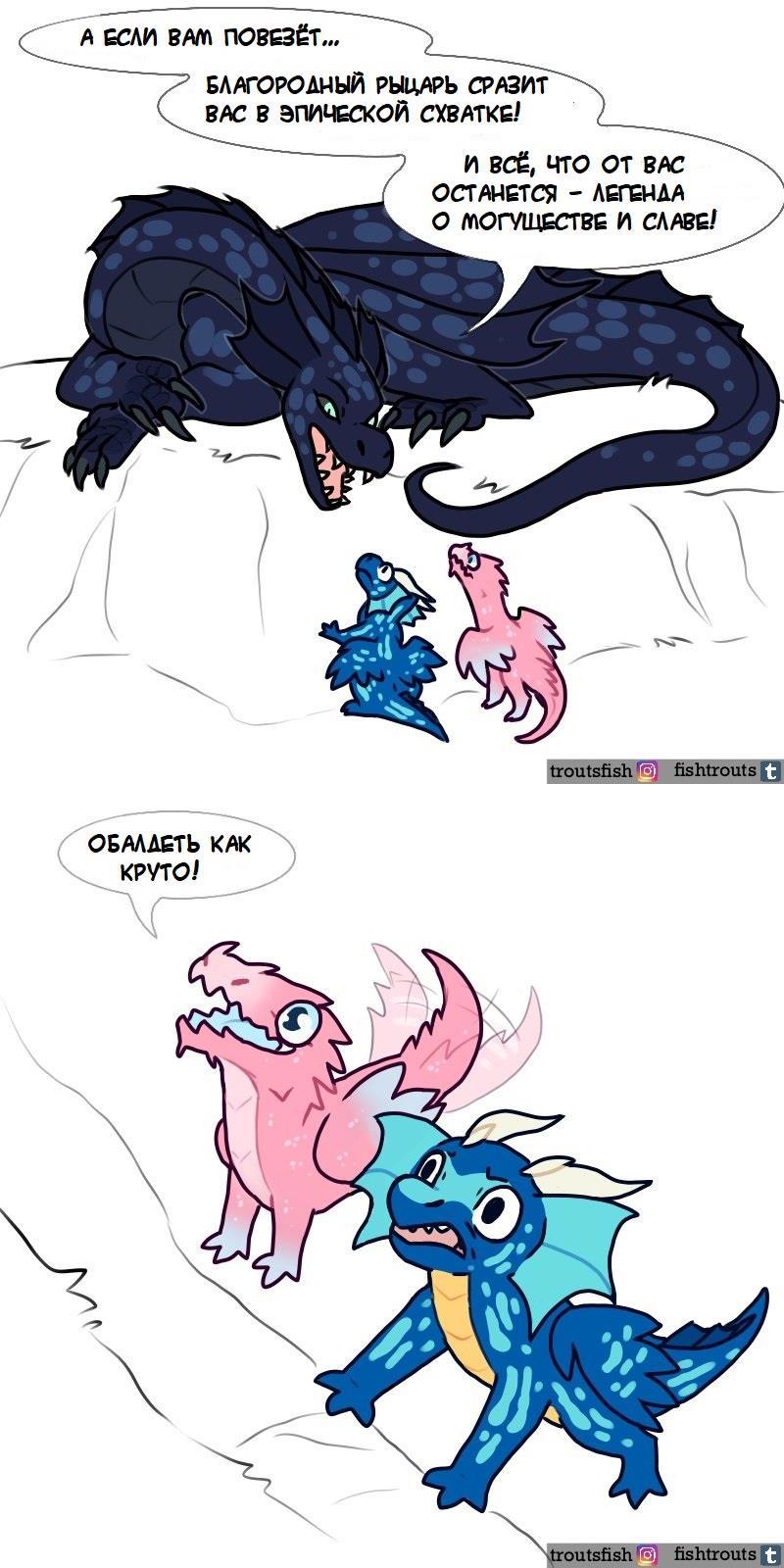 Синенькому дракончику идея явно не по душе, но по предыдущим выпускам (и требованиям к квесту) и так понятно, что он добряк %) С другой стороны, "квестодатель", возможно, просто стебётся над малышами - сам-то он не торопится отправляться в эпическую схватку с рыцарем, лежит на пригорке и в ус не дует.
