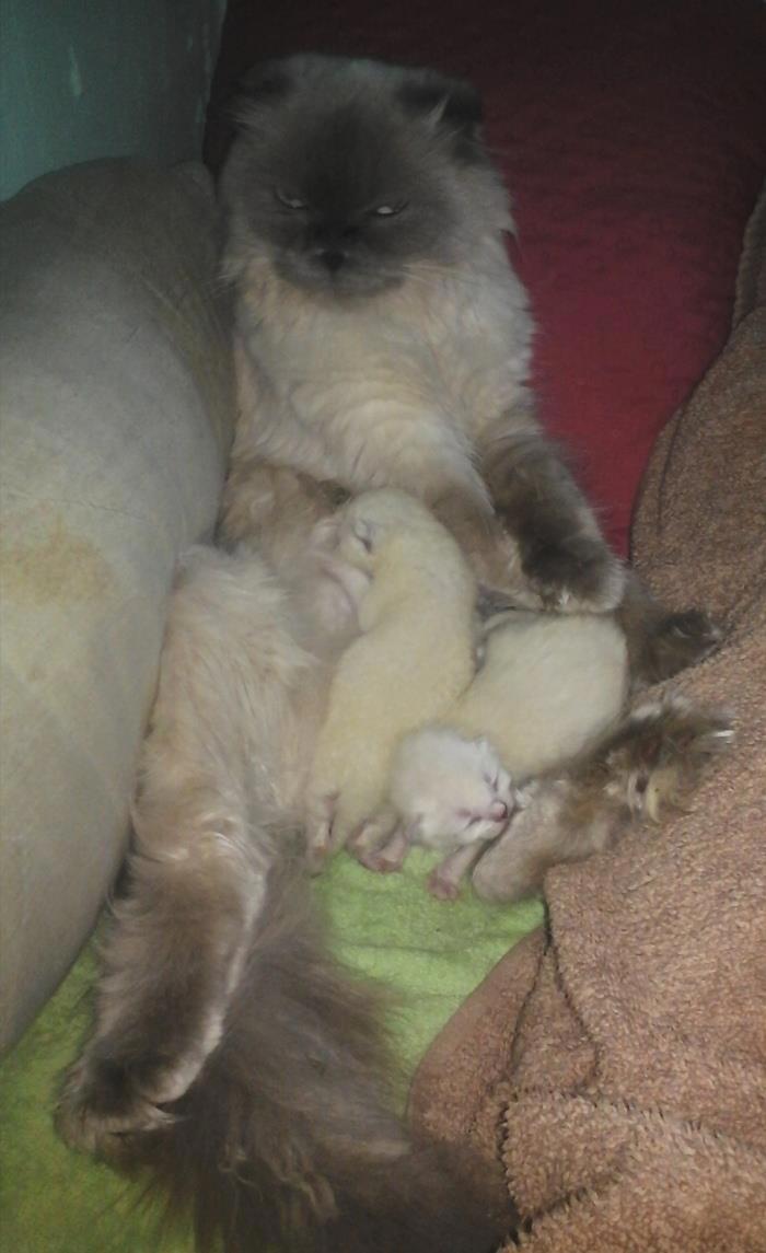 Отдали нам кошку с сюрпризом котейки появились через месяц))) Сюрприз был двойной)) Котяток было трое... и у каждого было заметно два чёрных шарика под хвостиком.