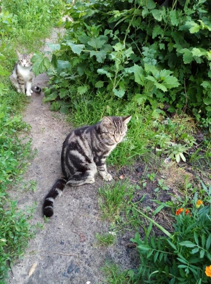 Сюрприз вырос и подарил нам Когтя. Это тот парень, что скромничает за кустиком.. На переднем плане подкидыш . Их с сестренками подкинули к нам во двор - сразу троих. Но видимо только двое смирились с наличием в доме двух собак. И жить остались у нас, получили клички Пёс и Чугамба. Пёс ведёт себя как собака . Может долго вылизывать попавшегося под его шершавый язычок члена семьи))