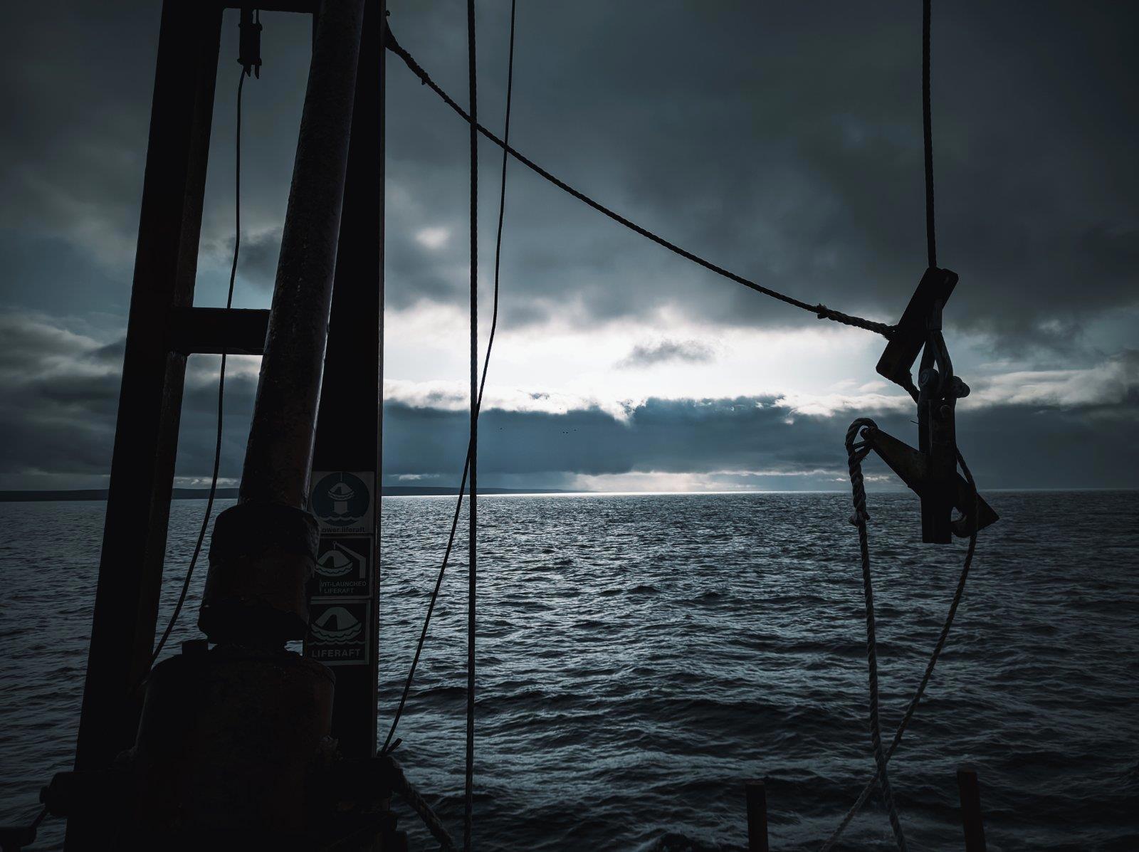 С левого борта вид неприветливый. Наползает дождевая туча — серая непроглядная хмарь, злой кусачий ветер. Море сливается с небом, и все прячется в серо-свинцовой мгле.
