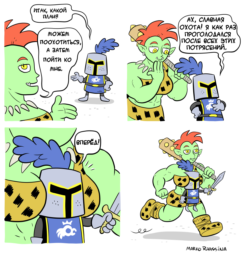Арка охоты весьма забавная и продолжает демонстрировать снаряжение Живчика. Там, где Зира только машет своей фирменной дубиной (хотя и весьма эффективно), у рыцаря есть лук, доспехи... Впрочем, не будем забегать вперёд.