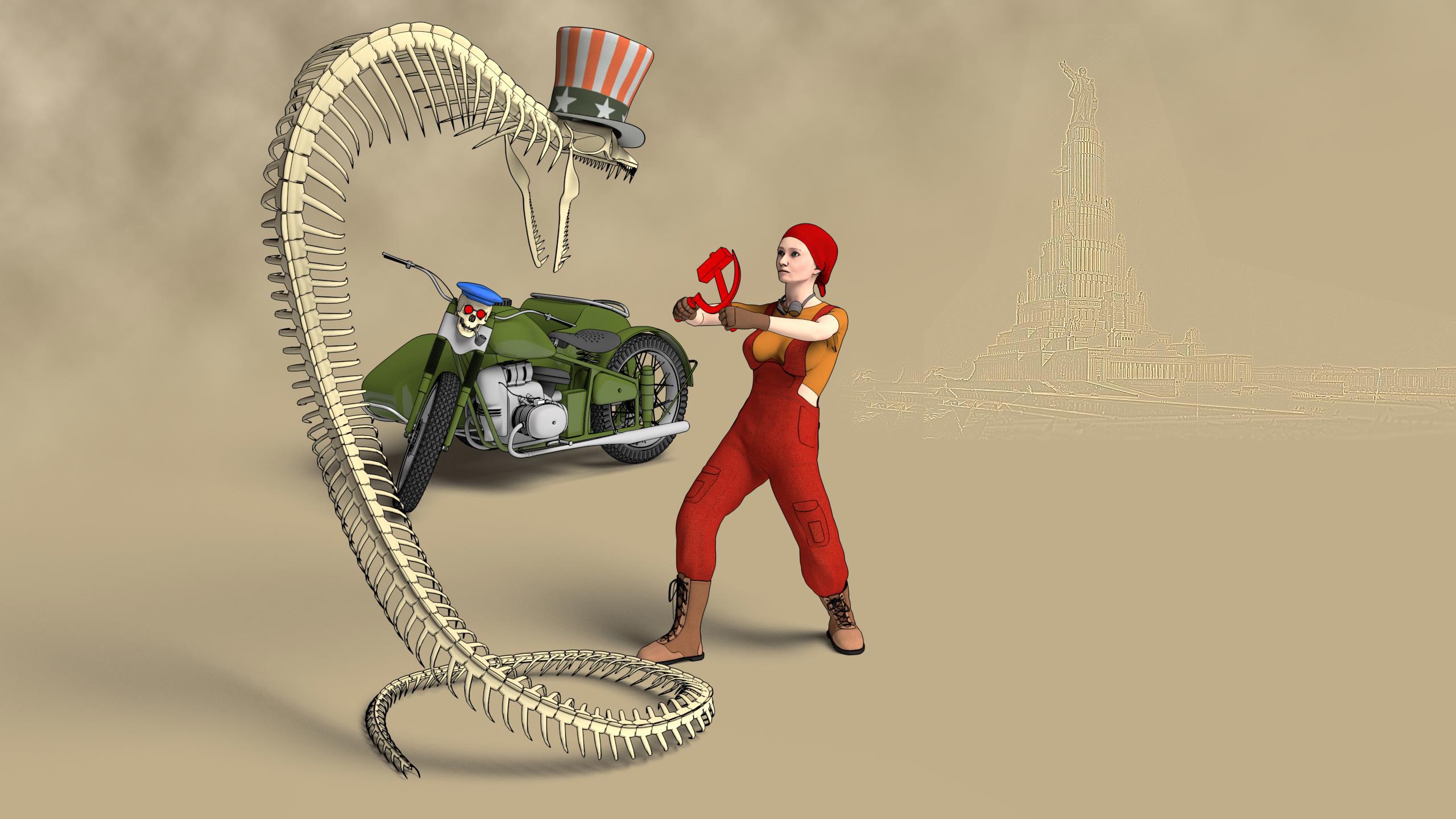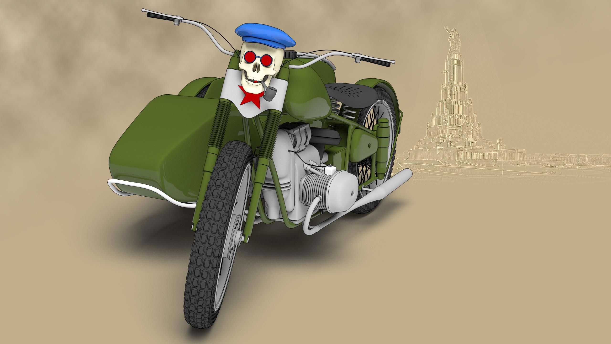 4. Это Фросин мотоцикл Урал. Он усилен усилителями и ускоряется ускорителями. Оборудован черепом Карла Радека. Радек попросил Партию разрешить ему бороться за дело Революции после смерти и перехода на тонкий план объективного бытия. Партия разрешила: