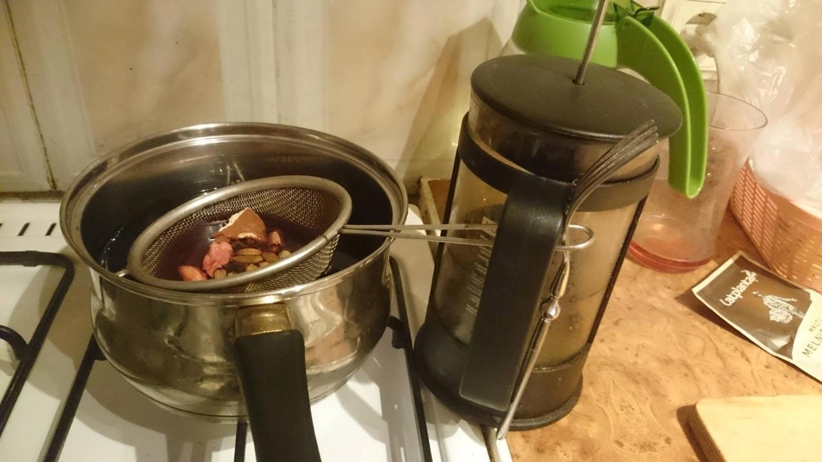 А поскольку процеживать - желания нет, то из подручных материалов на ходу Анатолий изобретает вот такую конструкцию с вилкой, ситечком и ручкой от кофейника.