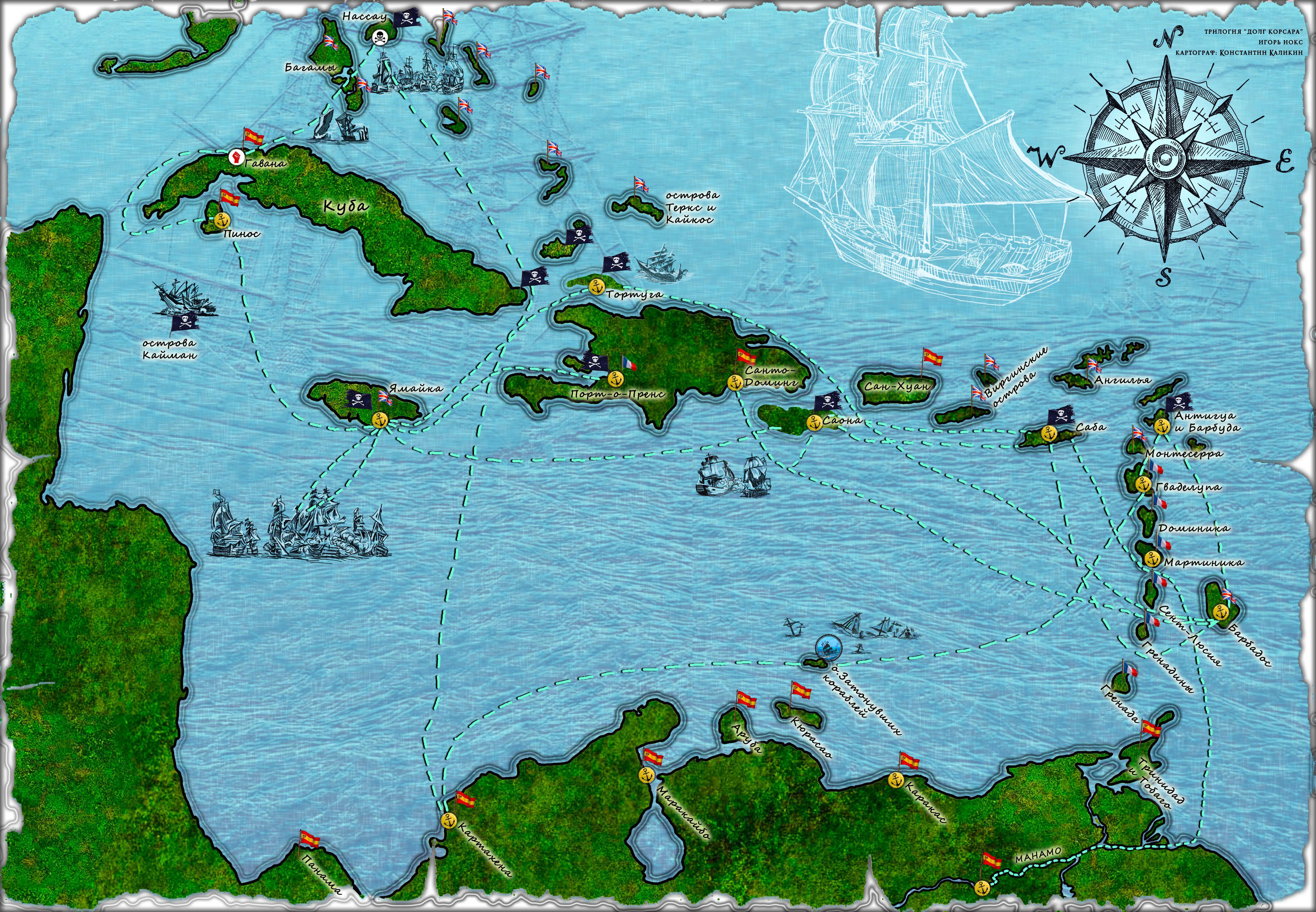 На этом хорошие новости не кончаются. Благодаря картографу Константину Каликину у меня появилась карта «Карибов». Стоит отметить, что карта уникальная — некоторые территории здесь специально увеличены или уменьшены в зависимости от их значимости (реальные масштабы карибских островов не позволяют уместить всё важное). Первоначальная идея заключалась в том, чтобы показать все маршруты передвижения капитана Рудры — от первой книги до последней. Но маршрут оказался столь запутанным, что разобрать его можно только по свежей памяти. Думаю, позже я сделаю пунктирные линии разными цветами в зависимости от книги, а пока как-то так.