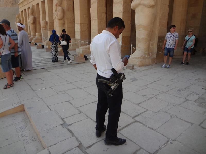Полицейский в храме Хатшепсут. Интересная кобура для пистолета-пулемета. Носимый боекомплект - 1 магазин в машинке, второй в подсумке.
