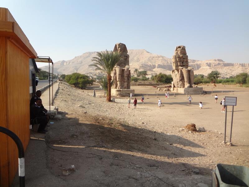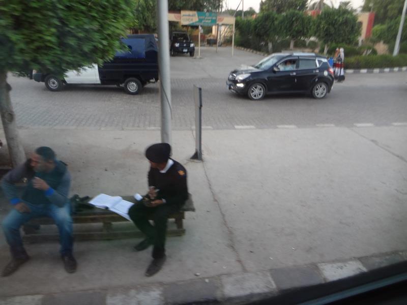 Типовой блокпост - вышки - башенки по краям, здание для служебных дел, бетонные будочки типа ДОТ, машина на дежурстве под навесом. С другой стороны - ровно то же. Плюс масса барьеров и "лежачих полицейских". (Попутно рассказ гида о том, зачем в Египте отбивали у статуй носы). Что забавно - хотя в основном полицейские- мусульмане, но постоянно блокпосты украшены охранными птицами из древнеегипетских символов, или просто современными орлами с флага.