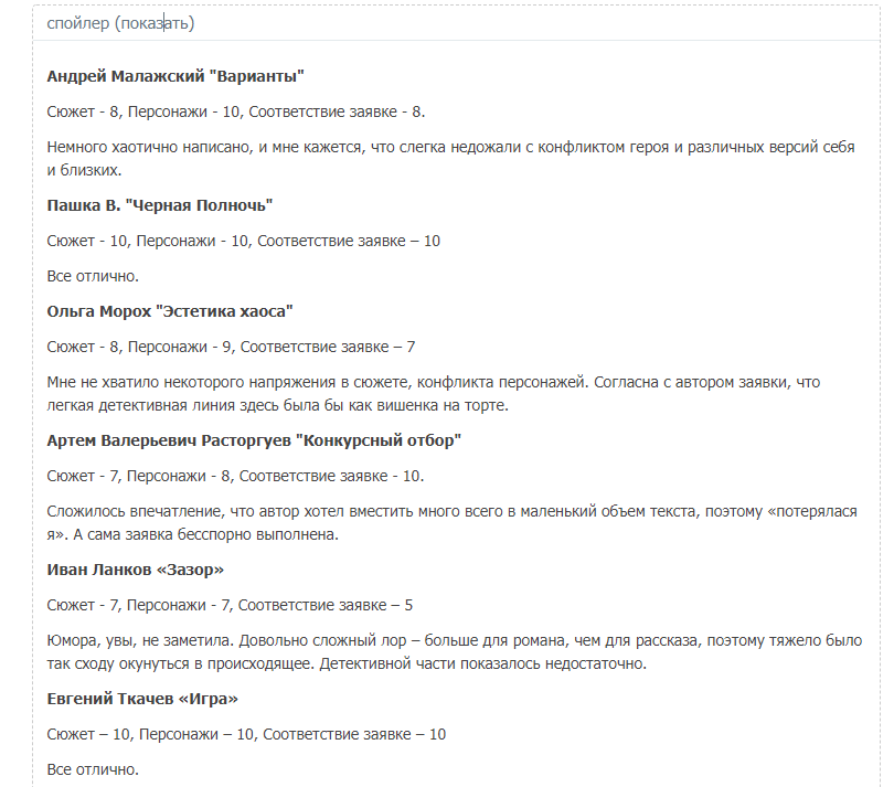 С 21 ноября участникам конкурса нужно будет прочитать каждое написанное произведение и прислать свои оценки личным сообщением организатору, чтобы избежать манипулирования баллами.